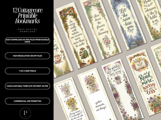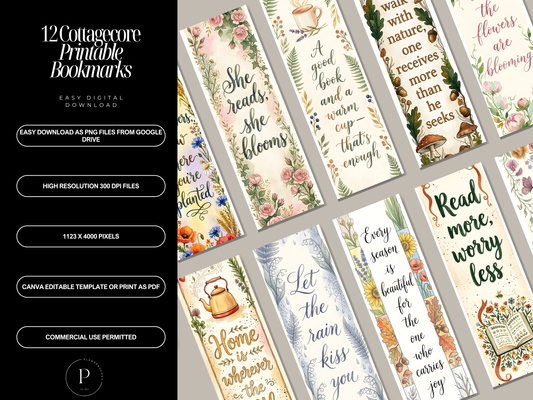 Cottagecore Printable Bookmarks Set of 12 – Vintage Floral 2"x7" Bookmark Bundle, PNG PDF Canva Editable Book Lover Gift | Commercial Use