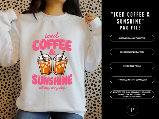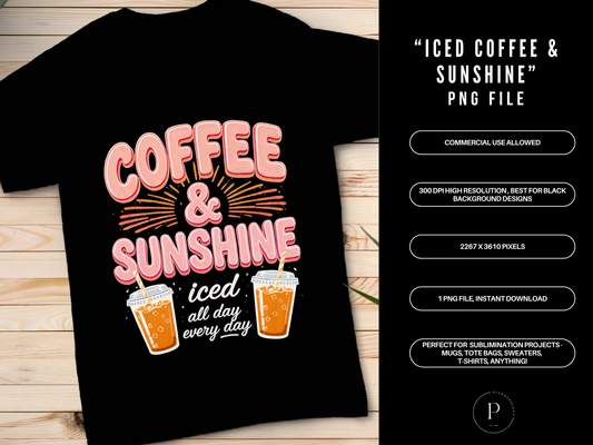 Coffee & Sunshine PNG Clipart – Summer Iced Coffee Shirt Design, Cute Coffee Lover Graphic, Sublimation PNG Download, POD Commercial Use