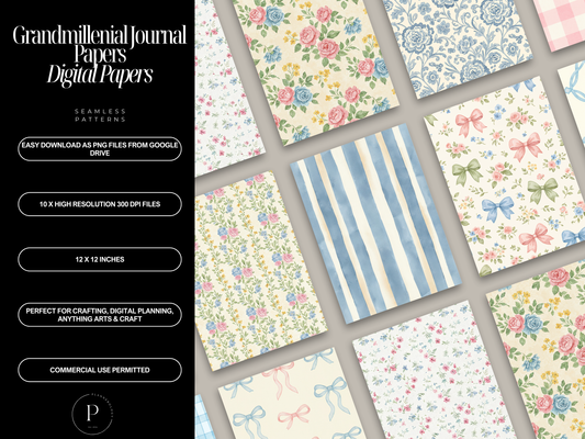 10 Grandmillennial Seamless Patterns Digital Paper Scrapbook Paper Bundle | Pastel Floral Journal Papers | Vintage Stripes Plaid| 300 DPI PNG Digital Paper