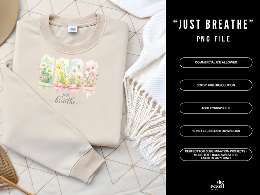 Just Breathe PNG Clipart | Floral Watercolor Self Care Design | Mental Health Quote Graphic for Shirts & Sublimation | POD Commercial Use