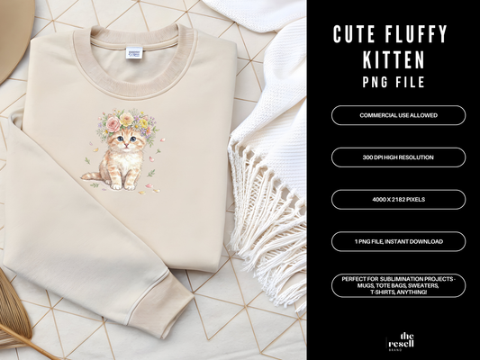 Cute Kitten PNG Floral Crown | Watercolor Cat Clipart | Cottagecore Animal Design for Sublimation & Apparel | POD Commercial Use