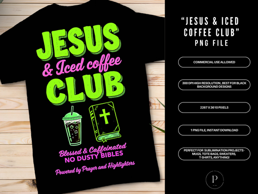 Jesus and Iced Coffee Club PNG Clipart – Christian Coffee Design, Blessed and Caffeinated Shirt Graphic for Sublimation, POD Commercial Use