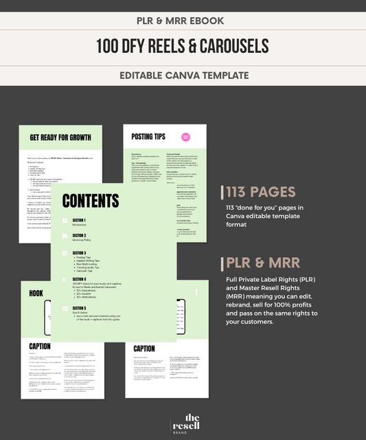 100 DFY Reels & Carousels | Instagram Digital Marketing | MRR & PLR | Canva Editable