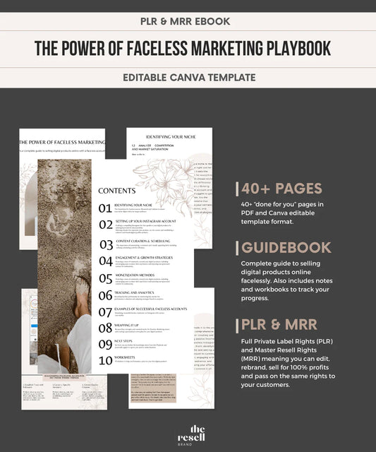 The Power of Faceless Marketing Playbook | MRR & PLR | 40+ Pages Digital Marketing Guide | How to Sell Digital Products Online | Canva Editable eBook