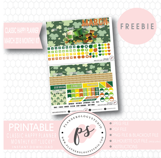 Lucky St Patrick's Day Classic Happy Planner March 2018 Monthly Kit Digital Printable Planner Stickers (PDF/JPG/PNG/Silhouette Cut File Freebie)