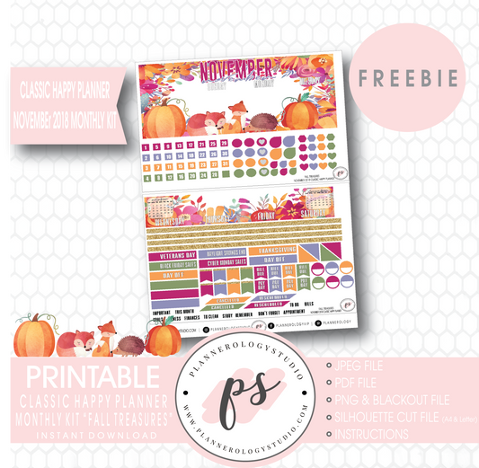 Fall Treasures Classic Happy Planner November 2018 Monthly Kit Digital Printable Planner Stickers (PDF/JPG/PNG/Silhouette Cut File Freebie)