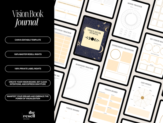 Vision Book Journal Canva Template | 33 Pages Editable | Vision Board & Gratitude Planner PLR + MRR | Manifestation Workbook