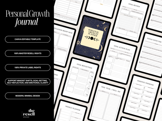Personal Growth Planner Canva Template | 27 Pages Editable | Self-Development Journal PLR + MRR | Digital Mindset Workbook
