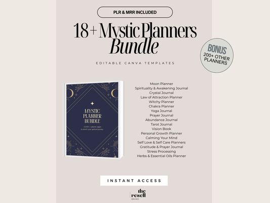 Mystic Planners Bundle Canva Templates | 18 Spiritual & Wellness Planners + 200 Bonus Planners | Editable PLR + MRR | Digital Self-Growth Collection