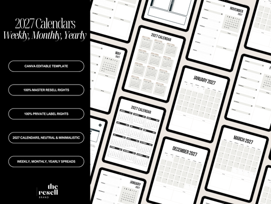 2027 Calendar Weekly Monthly Yearly Planner Diary | 75 Pages Editable Canva Template | Neutral Minimalist | PLR + MRR