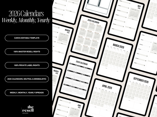 2026 Calendar Weekly Monthly Yearly Planner Diary | 77 Pages Editable Canva Template | Neutral Minimalist | PLR + MRR