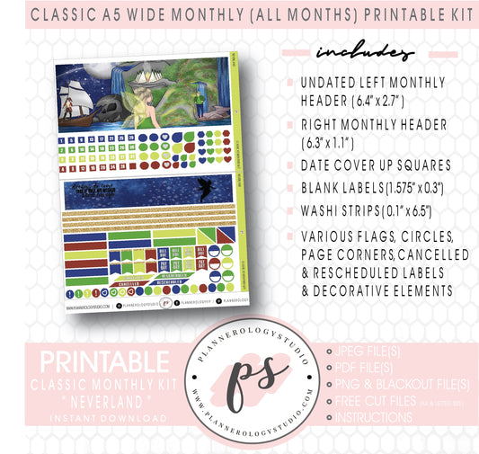Neverland Foil Ready Monthly Kit Digital Printable Planner Stickers (Undated All Months for Classic A5 Wide Planners)