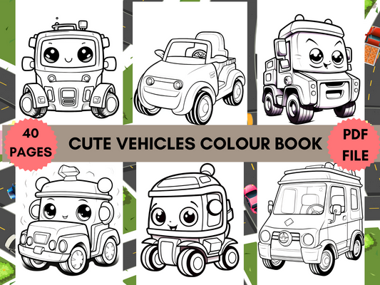 Cute Kawaii Vehicles Transportation Kids Coloring Book (40 Printable PDF Coloring Pages)