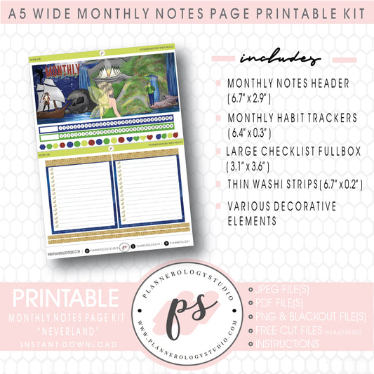 Neverland Monthly Notes Page Kit Digital Printable Planner Stickers (for use with Standard A5 Wide Planners)