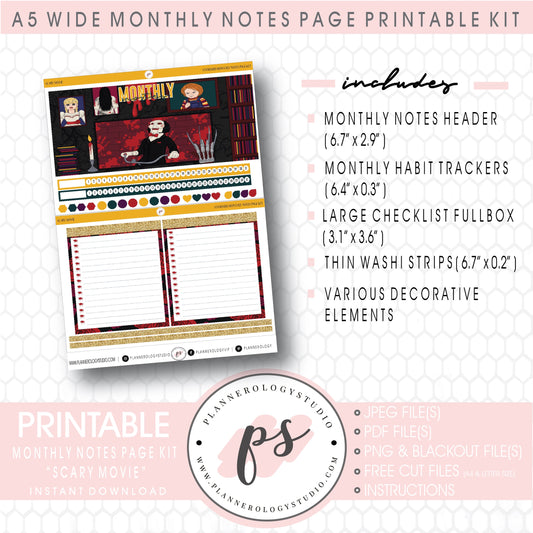 Scary Movie Monthly Notes Page Kit Digital Printable Planner Stickers (for use with Standard A5 Wide Planners)