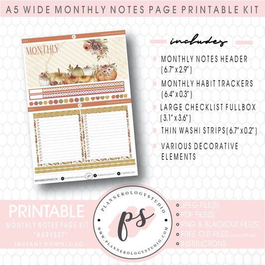 Harvest Monthly Notes Page Kit Digital Printable Planner Stickers (for use with Standard A5 Wide Planners)