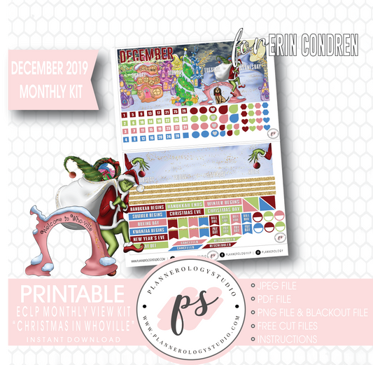 Christmas at Whoville (The Grinch) December 2019 Monthly View Kit Digital Printable Planner Stickers (for Standard A5 Wide Monthly 1.6" Width Date Boxes)