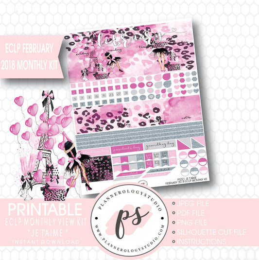 Je T'aime Valentine's Day February 2018 Monthly View Kit Printable Planner Stickers (for use with ECLP)