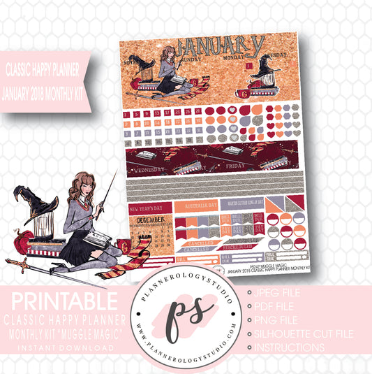 Muggle Magic (Harry Potter Theme) January 2018 Monthly View Kit Printable Planner Stickers (for use with Classic Happy Planner)