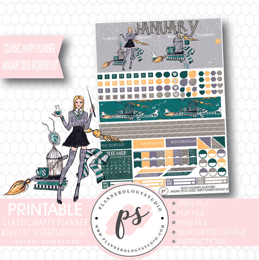 Hogwarts Adventures (Harry Potter Theme) January 2018 Monthly View Kit Printable Planner Stickers (for use with Classic Happy Planner)