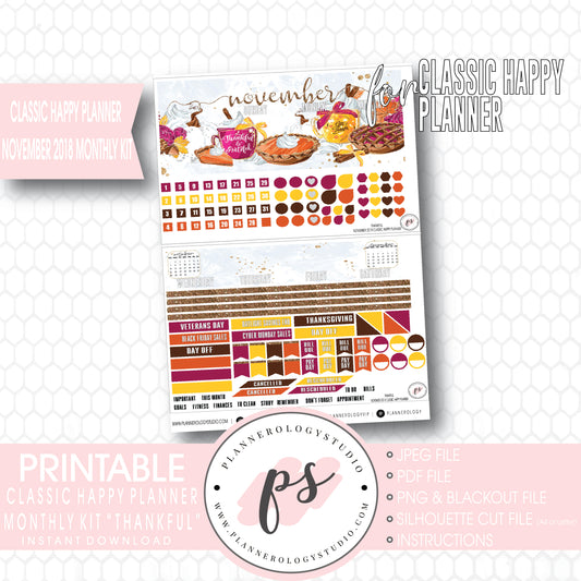 Thankful Thanksgiving November 2018 Monthly View Kit Printable Planner Stickers (for use with Classic Happy Planner)