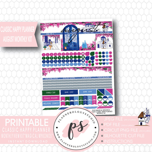 "Magical Mykonos" August 2017 Monthly View Kit Printable Planner Stickers (for use with Mambi Classic Happy Planner)
