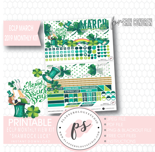 Shamrock Luck St Patrick's Day March 2019 Monthly View Kit Digital Printable Planner Stickers (for Standard A5 Wide Monthly 1.6" Width Date Boxes)