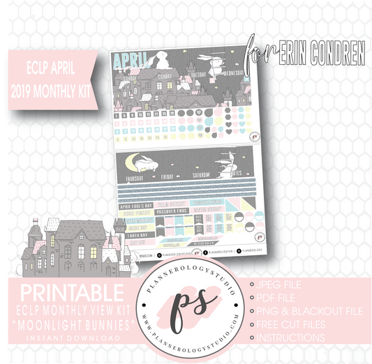Moonlight Bunnies April Easter 2019 Monthly View Kit Digital Printable Planner Stickers (for Standard A5 Wide Monthly 1.6" Width Date Boxes)