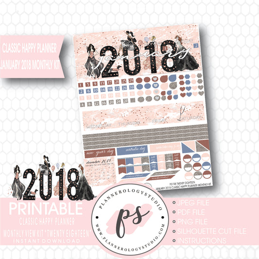 Twenty Eighteen New Year's January 2018 Monthly View Kit Printable Planner Stickers (for use with Classic Happy Planner)