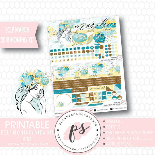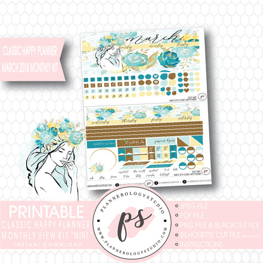 Mint March 2018 Monthly View Kit Digital Printable Planner Stickers (for use with Classic Happy Planner)