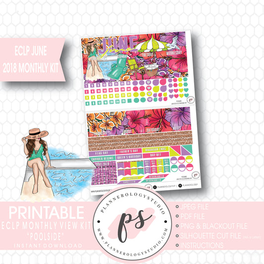 Poolside Summer June 2018 Monthly View Kit Digital Printable Planner Stickers (for Standard A5 Wide Monthly 1.6" Width Date Boxes)