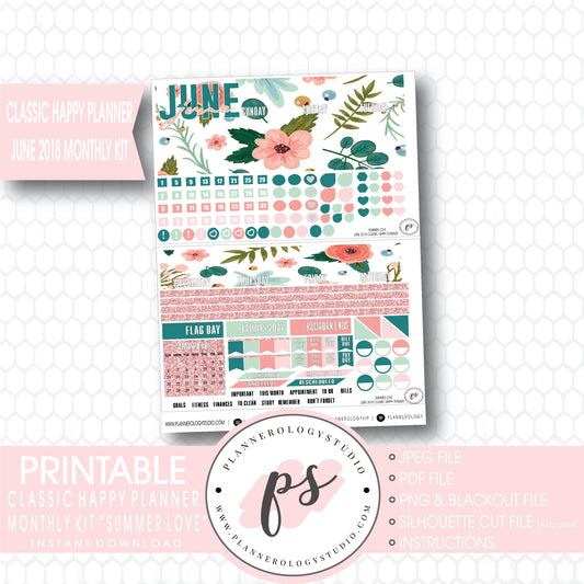 Summer Love June 2018 Monthly View Kit Digital Printable Planner Stickers (for use with Classic Happy Planner)