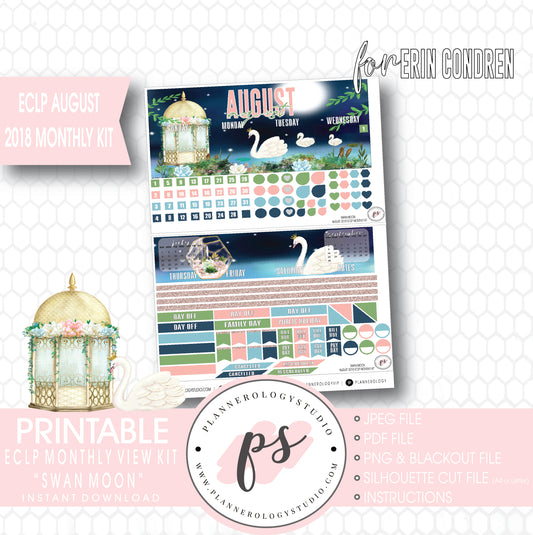 Swan Moon August 2018 Monthly View Kit Digital Printable Planner Stickers (for Standard A5 Wide Monthly 1.6" Width Date Boxes)