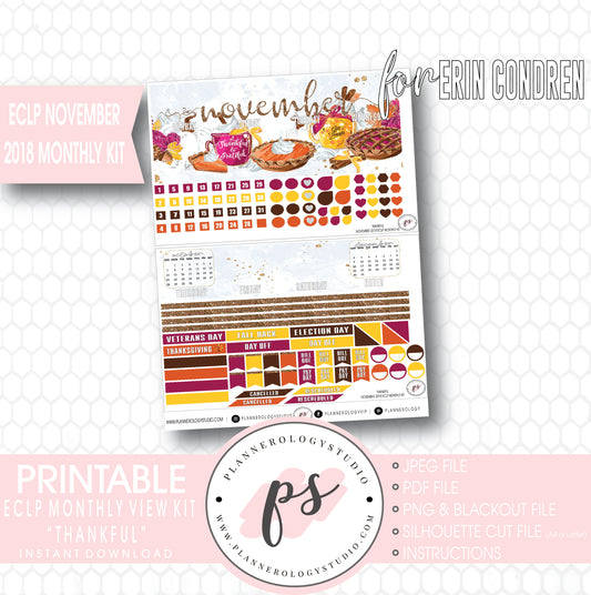 Thankful Thanksgiving November 2018 Monthly View Kit Printable Planner Stickers (for Standard A5 Wide Monthly 1.6" Width Date Boxes)