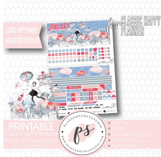 Miss Poppins (Mary Poppins) January 2019 Monthly View Kit Digital Printable Planner Stickers (for use with Classic Happy Planner)