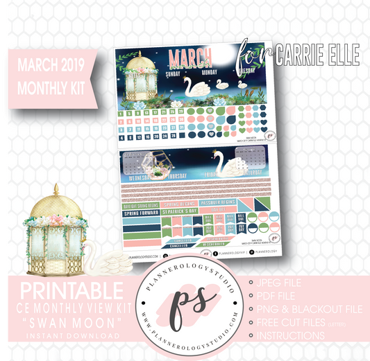 Swan Moon March 2019 Monthly View Kit Digital Printable Planner Stickers (for use with Carrie Elle Planner)