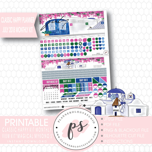 Magical Mykonos July 2018 Monthly View Kit Digital Printable Planner Stickers (for use with Classic Happy Planner)