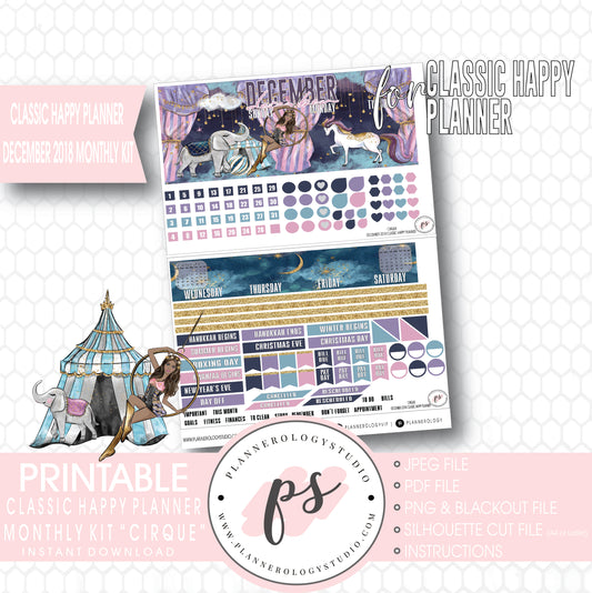 Cirque (Dark Skin Tone) December 2018 Monthly View Kit Digital Printable Planner Stickers (for use with Classic Happy Planner)