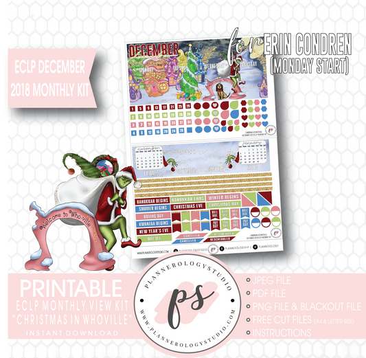 Christmas at Whoville (Grinch) December 2018 Monthly View Kit Digital Printable Planner Stickers (for Standard A5 Wide Monthly 1.6" Width Date Boxes) (Monday Start)