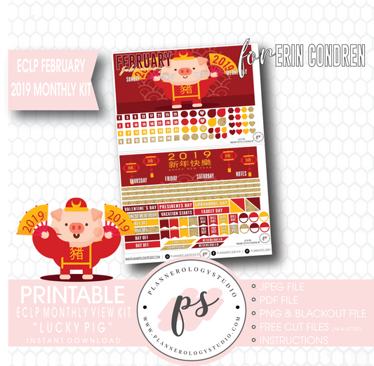 Lucky Pig (Chinese/Lunar New Year) February 2019 Monthly View Kit Digital Printable Planner Stickers (for Standard A5 Wide Monthly 1.6" Width Date Boxes)