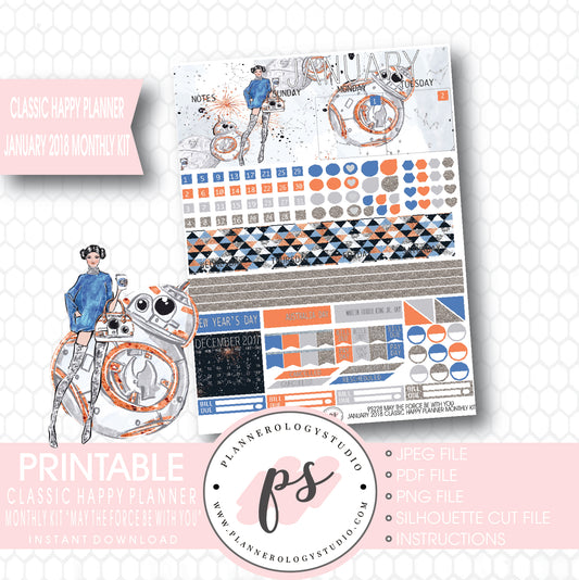 May the Force Be With You January 2018 Monthly View Kit Printable Planner Stickers (for use with Classic Happy Planner)