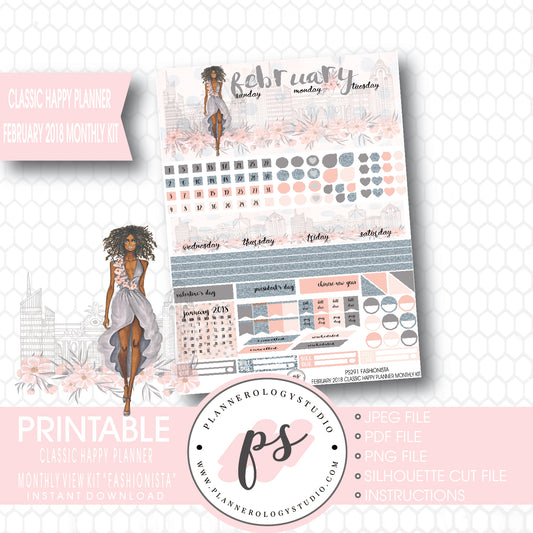 Fashionista (Dark Skin Tone) February 2018 Monthly View Kit Digital Printable Planner Stickers (for use with Classic Happy Planner)