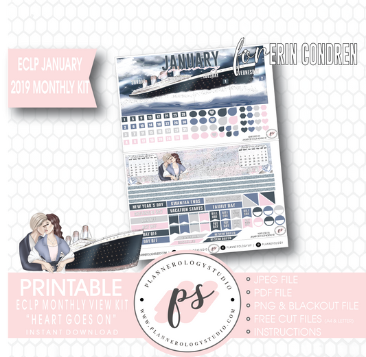 Heart Goes On (Titanic) January 2019 Monthly View Kit Digital Printable Planner Stickers (for Standard A5 Wide Monthly 1.6" Width Date Boxes)
