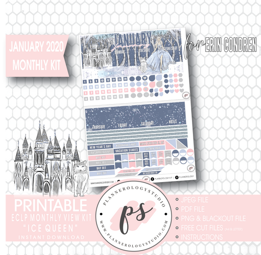 Ice Queen January 2020 Monthly View Kit Digital Printable Planner Stickers (for Standard A5 Wide Monthly 1.6" Width Date Boxes)