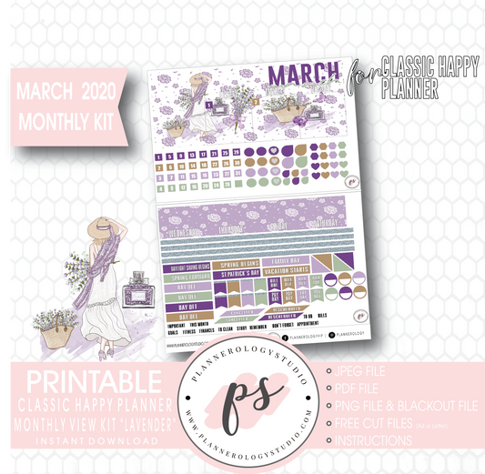 Lavender March 2020 Monthly View Kit Digital Printable Planner Stickers (for use with Classic Happy Planner)