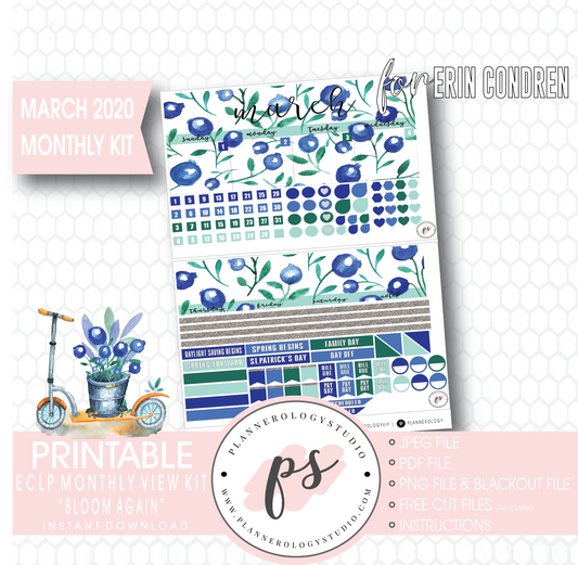 Bloom Again March 2020 Monthly View Kit Digital Printable Planner Stickers (for Standard A5 Wide Monthly 1.6" Width Date Boxes)