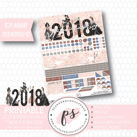 Twenty Eighteen New Year's January 2018 Monthly View Kit Printable Planner Stickers (for use with ECLP)