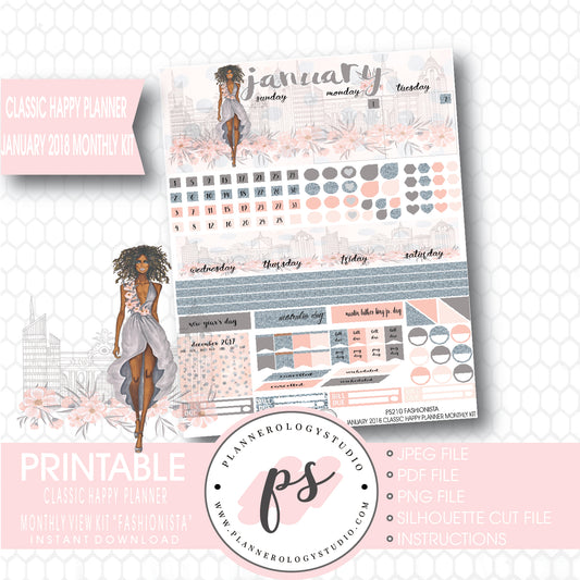 Fashionista (Dark Skin Tone) January 2018 Monthly View Kit Printable Planner Stickers (for use with Classic Happy Planner)