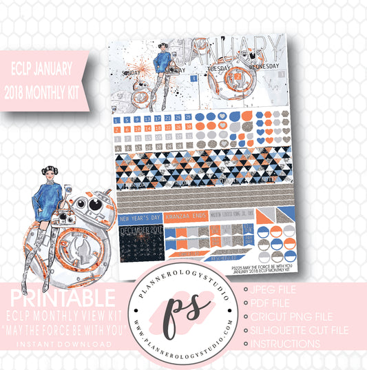 May the Force Be With You January 2018 Monthly View Kit Printable Planner Stickers (for use with ECLP)