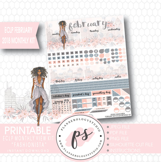 Fashionista (Dark Skin Tone) February 2018 Monthly View Kit Digital Printable Planner Stickers (for use with ECLP)
